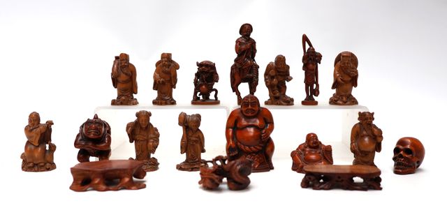 JAPON Suite de 6 netsuke en buis sculpté et 10 okimonos en bois