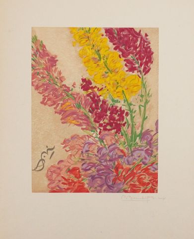 Édition originale tirée à 130 exemplaires sur Japon, illustrée de 17 compositions florales en couleurs par Anna de NOAILLES (1876-1933) interprétées en gravure sur bois par Pierre Bouchet, dont 5 à pleine page, 11 bandeaux et un cul-de-lampe. Il s’agit du premier ouvrage édité par les « Cent Femmes Amies des Livres ».