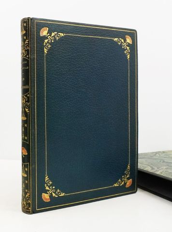 Grand in-4, maroquin turquoise, dos lisse richement orné et mosaïqué, large bordure dorée d'encadrement des plats avec motifs mosaïqués en écoinçons, double filet doré sur les coupes, large bordure intérieure dorée, tête dorée, couv. conservées, sous emboîtage (Dervois).