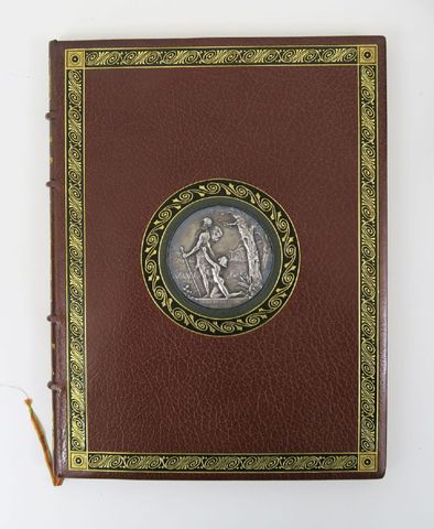 In-4 maroquin lavallière, frise mosaïquée en mar. noir à guirlande dorée sertie de filets dorés, petits carrés mosaïqués en mar. beige à décor doré et pastille de mar. noir, dos à nerfs orné de pièces mosaïquées en mar. noir à décor doré, titre doré, au centre du premier plat est encastrée une médaille en argent de Charles Meunier dédiée aux Amis de la Maison du Livre (1905), dont le revers est visible au contreplat, entourée d'un cercle de mar. noir à guirlande dorée et filets dorés, encadrement intérieur de mar. lavallière avec listels de maroquin brun, filets dorés et fleurons mosaïqués aux angles, couv. conservée, sous chemise demi-veau marbré à rabats (Ch. Meunier, 1907).