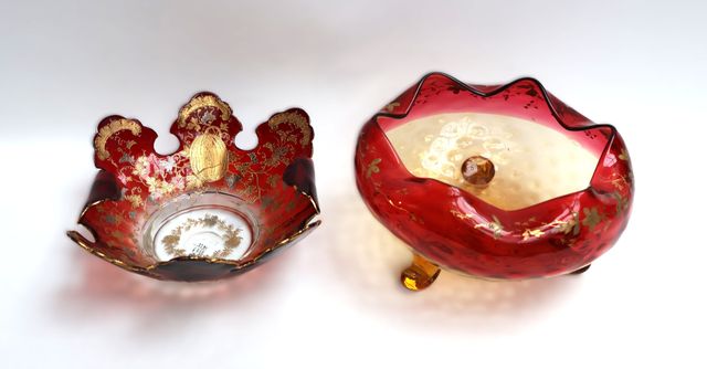 Coupe à bord découpé en cristal teinté rouge à riche décor émaill...