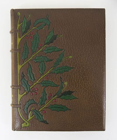 In-4 maroquin havane, dos à nerfs, titre doré, nerfs se prolongeant à froid sur les plats, petit décor mosaïqué dans les tons de brun et rouge au centre du dos (houx), grande branche de houx mosaïquée sur les plats, tr. dorées sur témoins, doublures de maroquin rouge bordeaux avec encadrement de filets dorés et listel de maroquin brun, gardes de tabis brun, sous étui à rebords (Marius Michel).