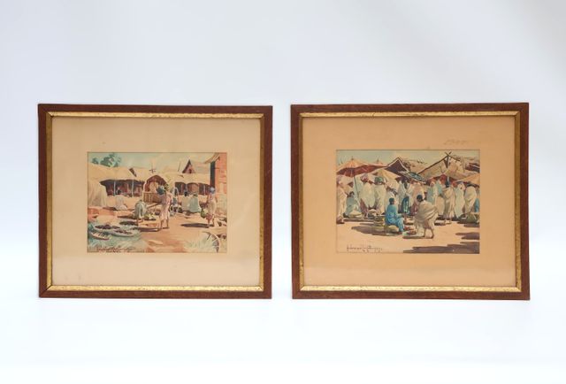 Ambroise RAKOTO (XXe siècle) Scènes de marché Paire d’aquarelle...