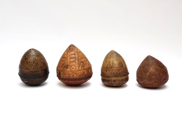 Suite de 4 boîtes piriformes dires "Batta" en peau de chèvre ou de chameau à décor géométrique peint
