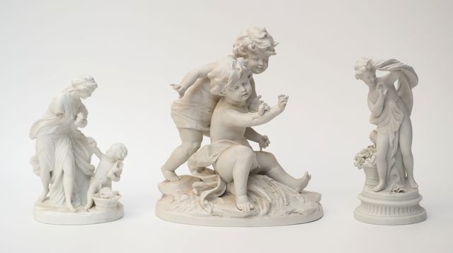Lot de 3 groupes sculptés en biscuit à décor de putti et femmes d...