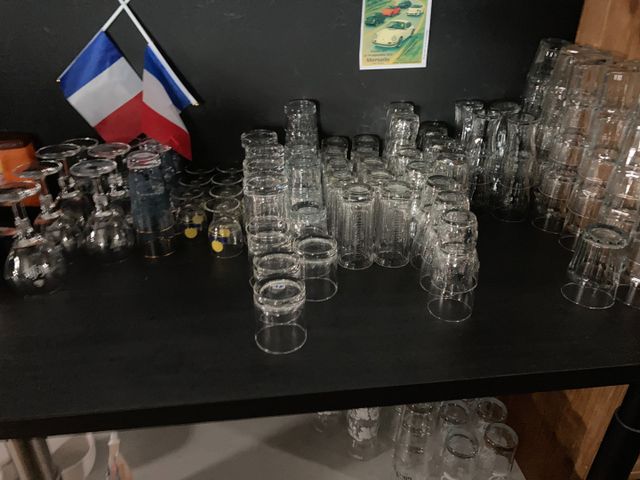 LOT DE VERRES, VAISSELLE ET COUVERTS, AVEC PETIT STOCK DE BOISSON...