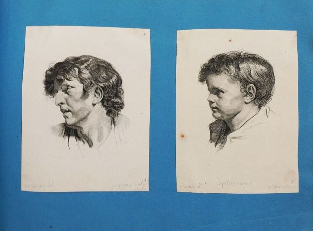 Album amicorum. Album constitué dans la première moitié du XIXe siècle renfermant : 6 gravures extraites du "1er Cahier de têtes de différens caractères" de J. B. GREUZE, 17 gravures extraites de la suite des Gueux de J. CALLOT (en tirage postérieur), 1 gravure (en tirage postérieur) d'après REMBRANDT "La Gitane espagnole Preciosa", une gravure à l'eau-forte d'A. Van OSTADE datée de 1671 (le cordonnier), une gravure de C. Visscher d'après BERGHEM (fontaine aux trois ânes, brunie), una aquarelle originale, 19 gravures diverses du XVIIe au XIXe siècle, un feuillet de poème manuscrit et quelques petits croquis à l'encre.