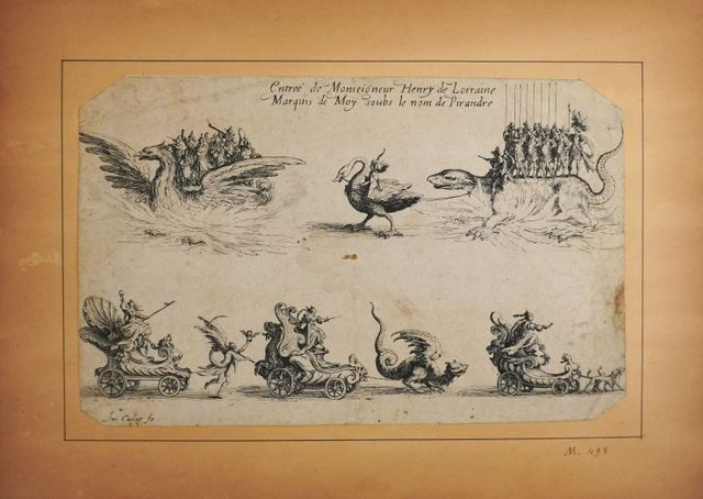 - Entrée de Monseigneur Henry de Lorraine Marquis de Moÿ sous le nom de Pirandre, signée "Jac. Callot fe.", montée sur planche, avec petit cachet humide à l'encre au dos ("E.L."), sans marges ni cuvette, découpée aux angles (réf. Meaume 498, "copie faite par le maître, dans de plus faibles proportions") + copie postérieure d'un détail de la gravure (représentant en inversé un char tiré par un dragon)