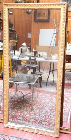 Miroir en bois et stuc doré à décor de frises de perles et de feu...