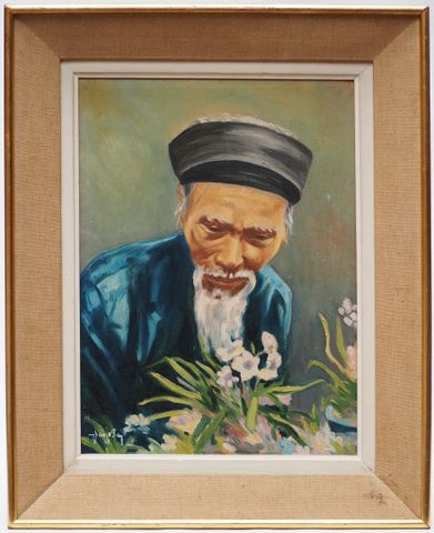 Van Ha TRAN (1911-1974) Portrait de vieillard observant des fleu