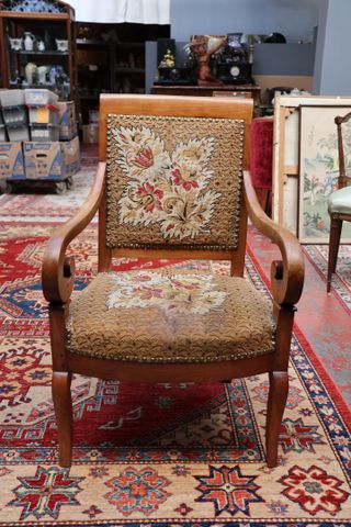 Fauteuil en bois naturel mouluré à dossier plat et accotoirs à cr...