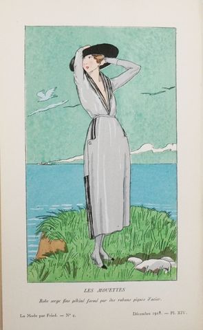 "Le premier numéro parait en septembre 1918, sous le titre La mode par Fried, et devient, dès le numéro 2, La mode dessinée par Fried. La vie éphémère de ce périodique s’achève avec le n° 8 d’avril-mai 1919. La plupart des planches de modèles en couleurs naissent de l’imagination de son illustrateur qui a donné son nom à la revue. Mais à partir du numéro 3 de novembre 1918, augurant d’une future collaboration, des modèles de Lelong sont publiés. Cette maison de couture s’associera en effet à Fried, à partir de 1920, transformant sa raison sociale en « Lelong & Fried »." notice du palais Galliera.