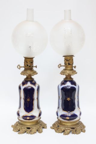 Paire de lampes à pétrole en porcelaine de Bayeux à décor floral ...