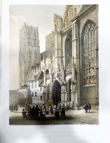 Belgique - STROOBANT (François) & STAPPAERTS (Félix). Monuments d'architecture et de sculpture en Belgique. Dessins d'après nature lithographiés en plusieurs teintes par F. Stroobant, Texte par F. Stappaerts. Bruxelles et Gand, Merzbach, sd (c. 1840-1850). In-folio chagrin rouge frappé d'un décor architectural gothique en relief à froid avec titre en lettres dorées sur le plat sup., encadrement à froid et armes dorées de Belgique au second plat, dos lisse, titre doré en long, roulette dorée sur les chasses, tr. dorées. Complet des 36 lithographies couleurs, petite mouillure claire en marge sup. progressive. Coiffes et mors légt frottés, rayure au second plat, petit accroc sur un mors, qqs petits frottés.