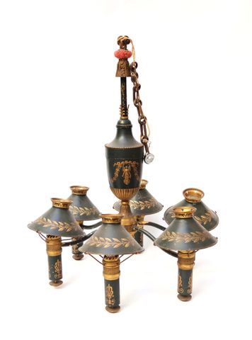 Lustre à quinquet à six lumières en bronze, métal doré et tôle la