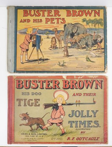 Dont 3 en version anglaise éditée par Dean & Son : Buster Browm his dog Tige and their jolly times ; Buster Brown and his pets ; Buster Brown funny tricks et 3 en traduction française distribués par Hachette : Les Dernières farces de Buster Brown et 2 exemplaires de Buster Brown chez lui (avec une couverture différente).