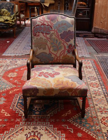 Fauteuil en noyer mouluré à dossier plat et accotoirs mouvementés