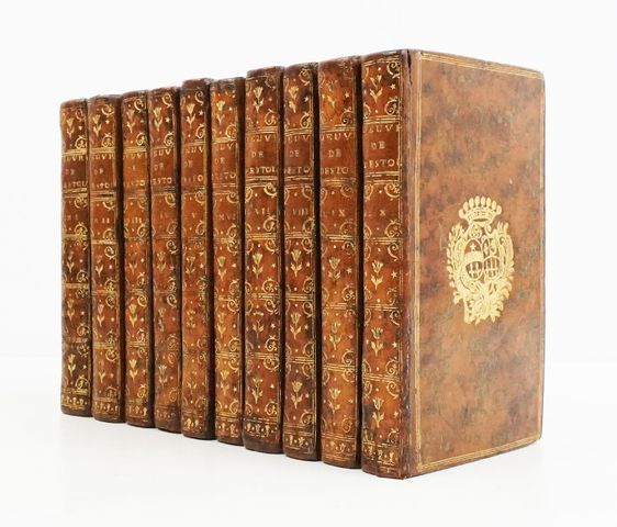 10 vol. in-12, veau marbré, dos lisses ornés, triple filet doré encadrant les plats avec armes dorées en leur centre, filet doré sur les coupes.