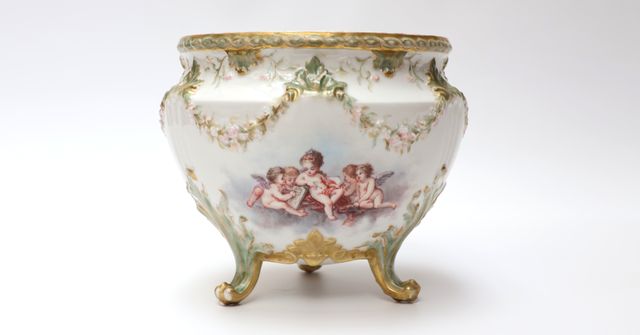 LIMOGES (attribué à) Cache-pot tripode en porcelaine dure émaill...