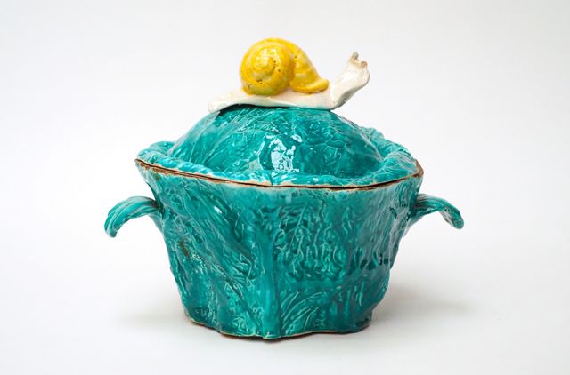 Légumier couvert en faïence émaillée polychrome simulant une lait...