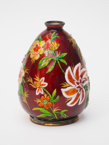 FAURE LIMOGES FRANCE Vase piriforme émaillé sur cuivre à décor fl...