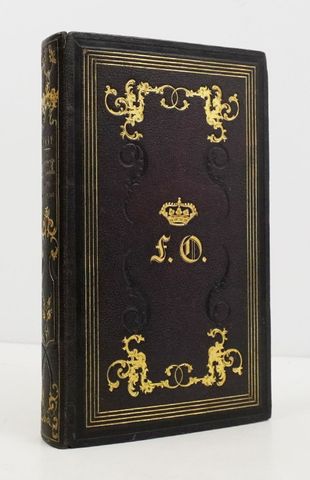 In-8, chagrin violine, dos lisse richement orné, large filet à froid et quadruple filet doré encadrant les plats, motifs dorés et à froid en leur centre dont un chiffre doré et couronné au premier plat, filet doré sur les coupes, triple filet d'encadrement intérieur doré, tranches dorées (reliure de l'époque signée de Charles Blaise).