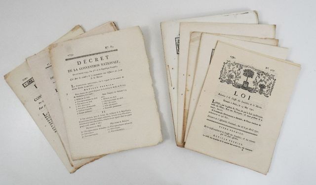 Ensemble de 9 décrets ou lois du XVIII°. In-4, brochés, non rognés : - Loi relative à l'organisation de l'artillerie & de l'infanterie de la marine. Dijon, Capel, 1792. 40 pp.
