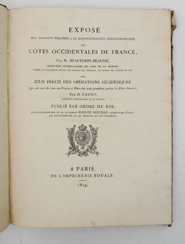 BEAUTEMPS-BEAUPRÉ (Charles-François). Exposé des travaux relatifs à la reconnaissance hydrographique des côtes occidentales de France, suivi d'un précis des opérations géodésiques qui ont servi de base aux cartes et plans des trois premières parties du Pilote français par M. Daussy. Paris, Imprimerie Royale, 1829.
