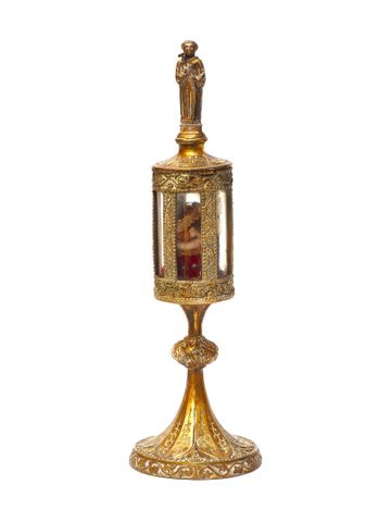 Reliquaire monstrance sur piédouche en bronze doré, métal et verr...