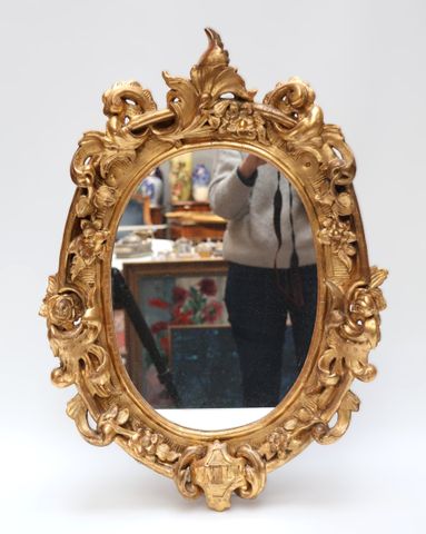 Miroir ovale en bois doré et sculpté de style baroque, chiffré ML...