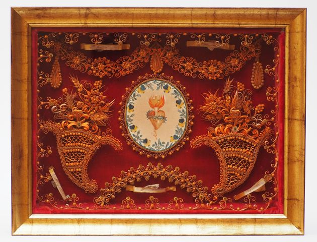 Reliquaire sous verre en papiers découpés, roulés, centré du Sacr...