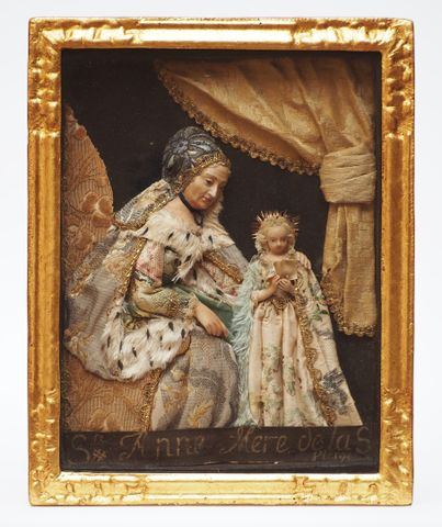 Sainte Anne et la Sainte Vierge Cire habillée dans son cadre vitr...