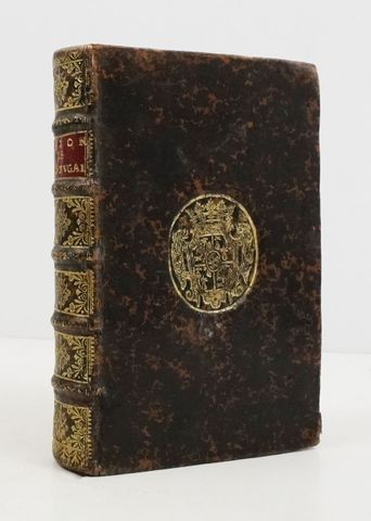 In-12, basane marbrée, dos à nerfs ornés, armes dorées au centre des plats, roulette dorée sur les coupes.
