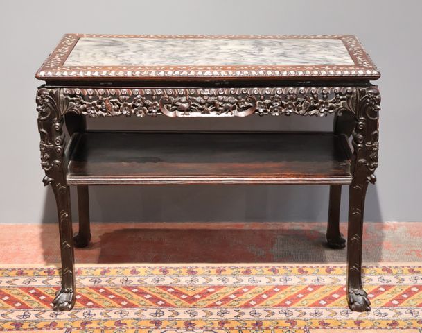 INDOCHINE - VIETNAM Table console en bois de fer sculpté, incrus...
