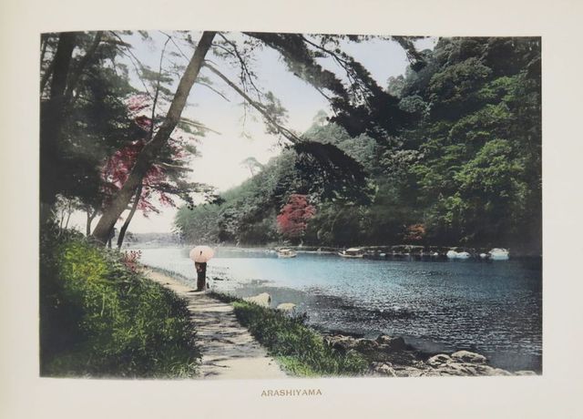 Japon - [OGAWA (Kazumasa)]. Things seen in Japan. [Tokyo], [Ogawa], [c. 1910]. In-folio oblong, soie verte, tranches dorées, mot "Japan" et branches de chrysanthèmes fleuries brodés sur le premier plat, belles aquarelles originales sur les gardes (reliure de l'éditeur). Rare album destiné aux touristes et comprenant 2 cartes en couleurs, 1 titre et 47 phototypies coloriées. Les photographie montrent les principaux sites du Japon : le mont Fuji, les principaux sites touristiques, temples, paysages, jardins, les cerisiers en fleurs... ainsi que des scènes typiques (mariage, 2 planches de costume, cérémonie du thé, ikebana...) Le photographe, Kazumasa Ogawa (1860-1929), est l'un des pionniers de la photographie au Japon. Il fut l'élève de Shimooka Renj? avant d'aller se perfectionner aux États-Unis. En 1884 il ouvrit le premier studio photographique de Tokyo, fut mandaté par le gouvernement pour faire un inventaire photographique des biens culturels et ouvrit le premier atelier de phototypie du Japon, publiant ses propres ouvrages ainsi que des magazines. Il fut l'un des membres fondateurs de la société photographique japonaise. Les légendes, en anglais, français et russe se trouvent au verso de la photographie précédente. Bon exemplaire. Coins et coiffes usagés.