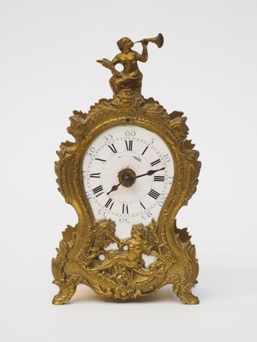 Réveil en forme de cartel en laiton à décor rocaille d'une femme ...
