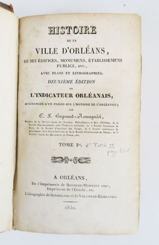Orléans - VERGNAUD-ROMAGNESI (Charles-François). Histoire de la ville d'Orléans, de ses édifices, monumens, établissemens publics, etc... avec plans et lithographies. Orléans, Rouzeau-Montaut aîné, 1830. 2 tomes en 1 volume fort in-8, ½ veau époque. Reliure usagée avec mors coupés. 3 plans de la ville (1 détaché), 5 planches dont 1 déchirée sans manques. Rousseurs.