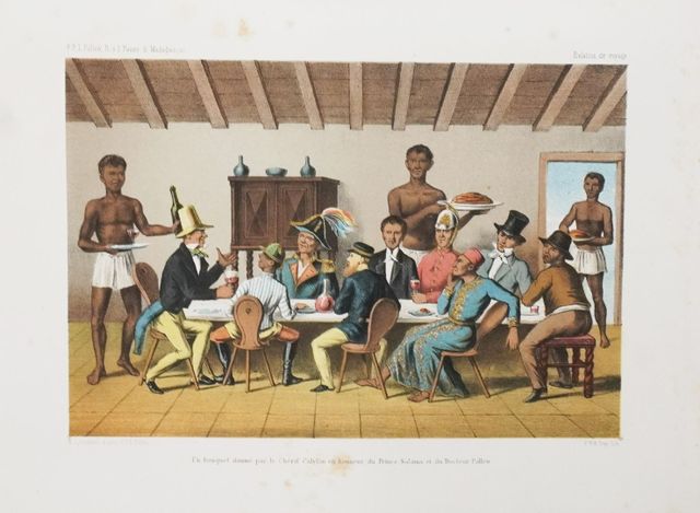 Partie seule de la relation du voyage de François Pollen sur l'île de Madagascar. Elle comprend 2 cartes lithographiées, et 43 planches lithographiées à deux teintes ou coloriées (sur 48) représentant des vues, costumes, scènes de genre, scènes de chasse et de pêche. Il manque également les pages de texte 153 à 168.