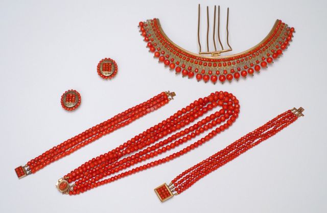 Parure en or jaune 750°/°°, pomponne et corail facetté comprenant un diadème, une paire de boucles, un collier trois rangs retenant un pendentif figurant un buste de dame en camée, et deux bracelets