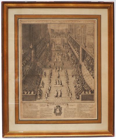 Paire de gravures encadrées sous verre- titrées "Première représentation de la Cérémonie du Sacre du Roy Louis XV dans l'église de Reims le XXV Octobre M.DCC.XXII dans le moment que sa Majesté va prester les Serments du Royaume après l'arrivée de la Ste Empoule" et "Seconde représentation du Sacre du Roy Louis XV dans l'église Métropolitaine de Reims le XXV Octobre M.DCC.XXII avec indications de chaque personnage représenté et places"