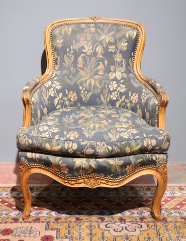 Bergère en noyer mouluré et sculpté, garniture de tissu polychrom...