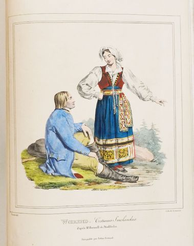 Il comprend [2] ff. (titre et table), une carte gravée dépliante avec les contours rehaussés, 8 vues lithographiées, et 2 planches de costumes lithographiées et aquarellés. Avec le prospectus du libraire pour le voyage de Duperrey, in fine (12 pp.). Ex-libris A.M. numéroté.