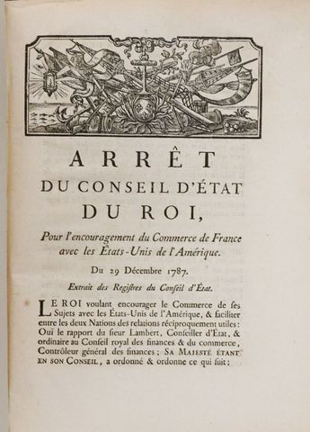 Amérique du Nord – États-Unis. Arrêt du conseil du roi, pour l'encouragement du commerce de France avec les États-Unis de l'Amérique. Paris, Imprimerie Royale, 1788.