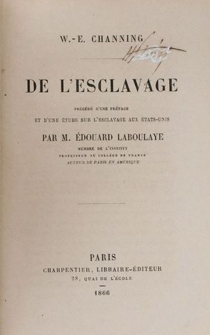 CHANNING (William Ellery). De l'esclavage. Paris, Charpentier, 1866.