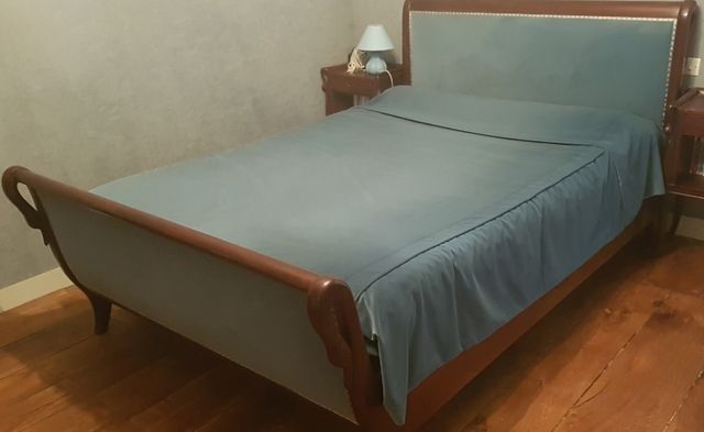 Lit en acajou massif à déor sculpté de col de cygne, garniture de...