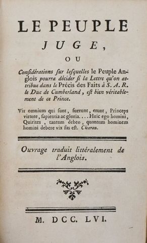 [États-Unis]. Le peuple juge, ou considérations sur lesquelles le peuple Anglois pourra décider si la lettre qu'on attribue dans le Précis des faits à S. A. R. le duc de Cumberland, est bien véritablement du prince. Sl, 1756.