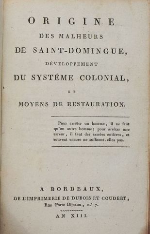 CHOTARD. Origine des malheurs de Saint-Domingue, développement du système colonial et moyens de restauration. Bordeaux, imprimerie de Dubois et Coudert, an XIII [1804].