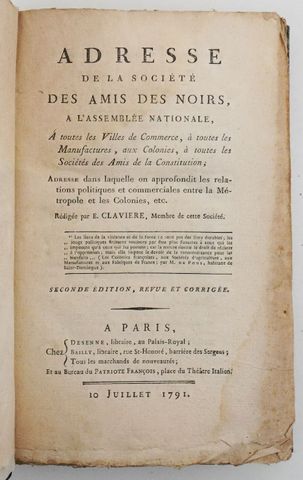 CLAVIÈRE (Étienne). Adresse de la Société des Amis des Noirs, à l'Assemblée Nationale, à toutes les villes de commerce, à toutes les manufactures, aux colonies, à toutes les Sociétés des Amis de la Constitution. Adresse dans laquelle on approfondit les relations politiques et commerciales entre la métropole et les colonies. Paris, Belin, Desenne, Bailly, et au bureau du Patriote François, 10 juillet 1791.