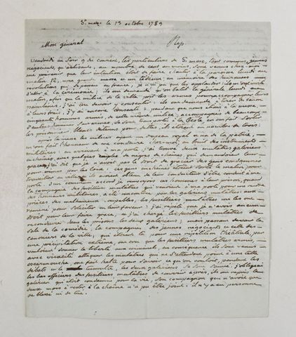 Dès la fin de 1789, les premiers troubles éclatèrent dans la partie française de Saint-Domingue (actuelle République d’Haïti). La présente lettre, écrite par le commandant de Couagne, en poste à Saint-Marc, témoigne du climat tendu qui régnait alors dans la colonie : attroupement devant la maison du commandant, incident entre Blancs et fusiliers mulâtres soupçonnés de vouloir libérer des esclaves, mise à sac de la maison d’un huissier de justice. (détails sur demande.)