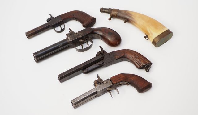 Lot de 4 pistolets à pistons + poire à poudre en corne Expert : ...